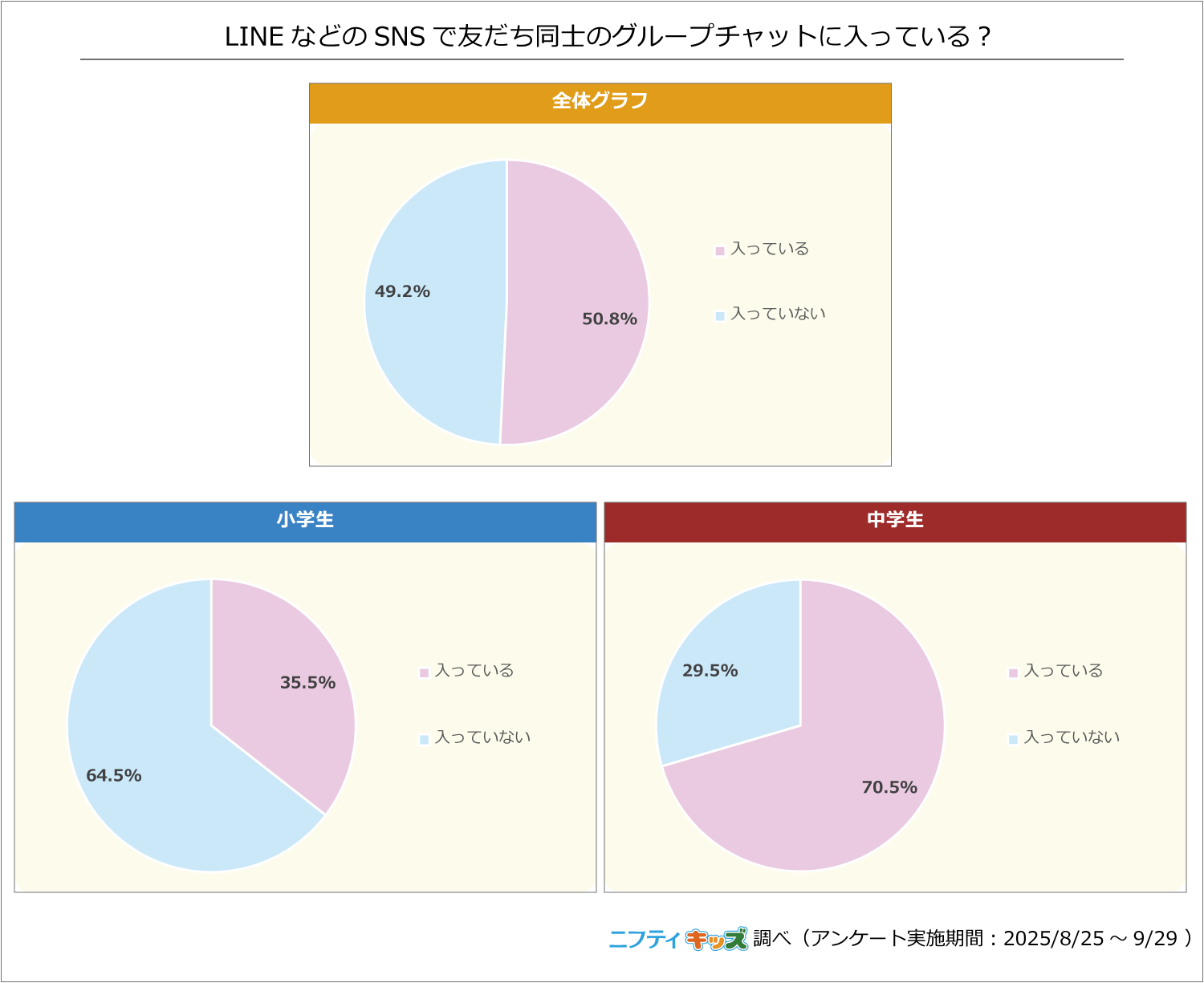 「入っている」と回答した小中学生は80.3%でした。2024年の調査(注1)では72%だったため、グループに所属している子どもたちは増加傾向にあるようです。