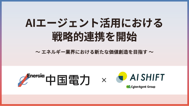 株式会社サイバーエージェント(本社:東京都渋谷区、代表取締役:藤田晋)のグループ会社である株式会社AI Shift(本社:東京都渋谷区、代表取締役社長:米山結人、以下「AI Shift」)と中国電力株式会社(本社:広島県広島市、代表取締役社長執行役員:中川賢剛、以下「中国電力」)は、AIエージェント※1活用に向けた戦略的連携に係る契約を本日締結しましたので、お知らせします。