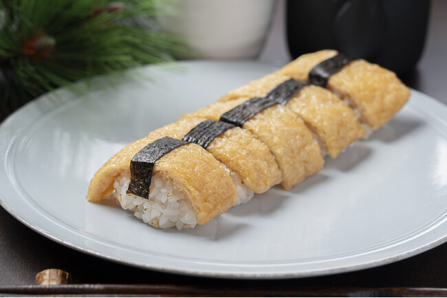 お揚げの新しい表情を見せる「寿司いなり」。出汁の旨みがぎゅっと詰まったむろや自慢のお揚げと、爽やかなゆず酢飯の相性は抜群です。