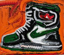 本展では、渡米の前後から描き始めた具象的なモチーフの新作を中心に、活動初期から手掛けている抽象画も合わせて展示します。著名人や、その著名人を象徴するアイテムを描くことで、言語に依らず視覚によって思想を表現することを試みます。