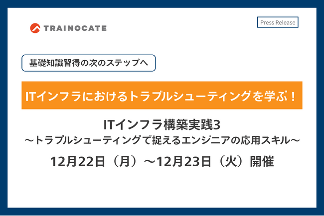 トレノケート株式会社(本社:東京都新宿区、代表取締役社長:早津 昌夫)は、ITインフラトレーニングの新コース「ITインフラ構築実践3~トラブルシューティングで捉えるエンジニアの応用スキル~」を2025年12月22日より提供開始します。本コースは、Windows および Linux で構成された企業ITインフラにおいて発生する様々なトラブル事例を元に、ITインフラ技術者のスキル向上を狙うハンズオン中心のトレーニングです。