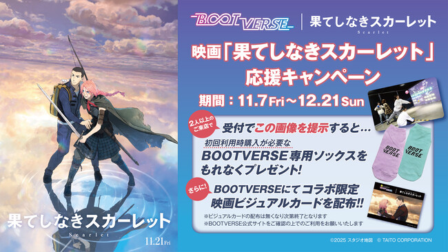 [画像3: https://prcdn.freetls.fastly.net/release_image/41970/633/41970-633-8c4f99729b8f5944331e0f8a2cb9c8b1-1920x1080.jpg?width=536&quality=85%2C75&format=jpeg&auto=webp&fit=bounds&bg-color=fff ]BOOTVERSE店舗では、映画『果てしなきスカーレット』がもっと楽しめる、また、BOOTVERSEのパーティースポーツがもっと楽しめるような来店キャンペーンを実施いたします。期間中は、店内特製フォトスポットの設置など、コラボ仕様となりますので映画を観る前・観た後に是非、ご来店ください。