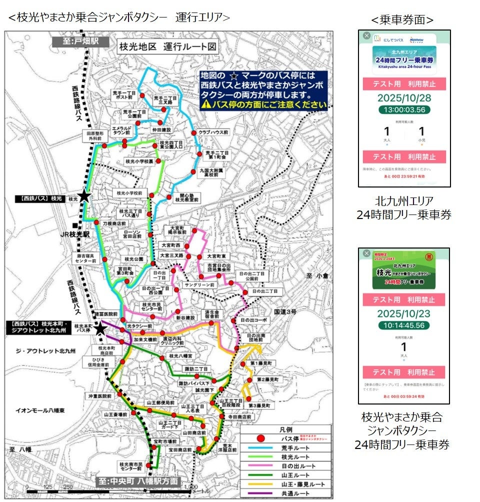 一般社団法人九州MaaS協議会会員の西鉄バス北九州(株)(北九州市小倉北区 代表取締役社長:吉田透 以下、西鉄バス)及び第一交通産業(株)(北九州市小倉北区 代表取締役社長:田中亮一郎 以下、第一交通)は、北九州市枝光地区において便利でお得にご利用いただける『西鉄バス×枝光やまさか乗合ジャンボタクシー24時間フリー乗車券』(以下、本乗車券)を、11月10日(月)より期間限定で販売します。