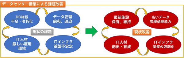 現地では、データセンター施設の不足や老朽化に起因して、データ処理能力、人材確保に課題を抱えており、環境改善が必要です。本実証事業では下図に示す課題改善を目的に、市場・法務・技術面を検証し、事業計画書を作成します。今後、現地環境を考慮したエコフレンドリーなデータセンター計画を推進し、ITインフラ基盤の強靭化、およびIT人材創出・育成等を通じて、現地のITインフラ基盤の持続可能な発展に貢献してまいります。