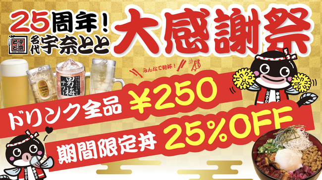 25周年の「25」に感謝を込めて、全国の宇奈ととでドリンク全品250円(税込)を実施します。
