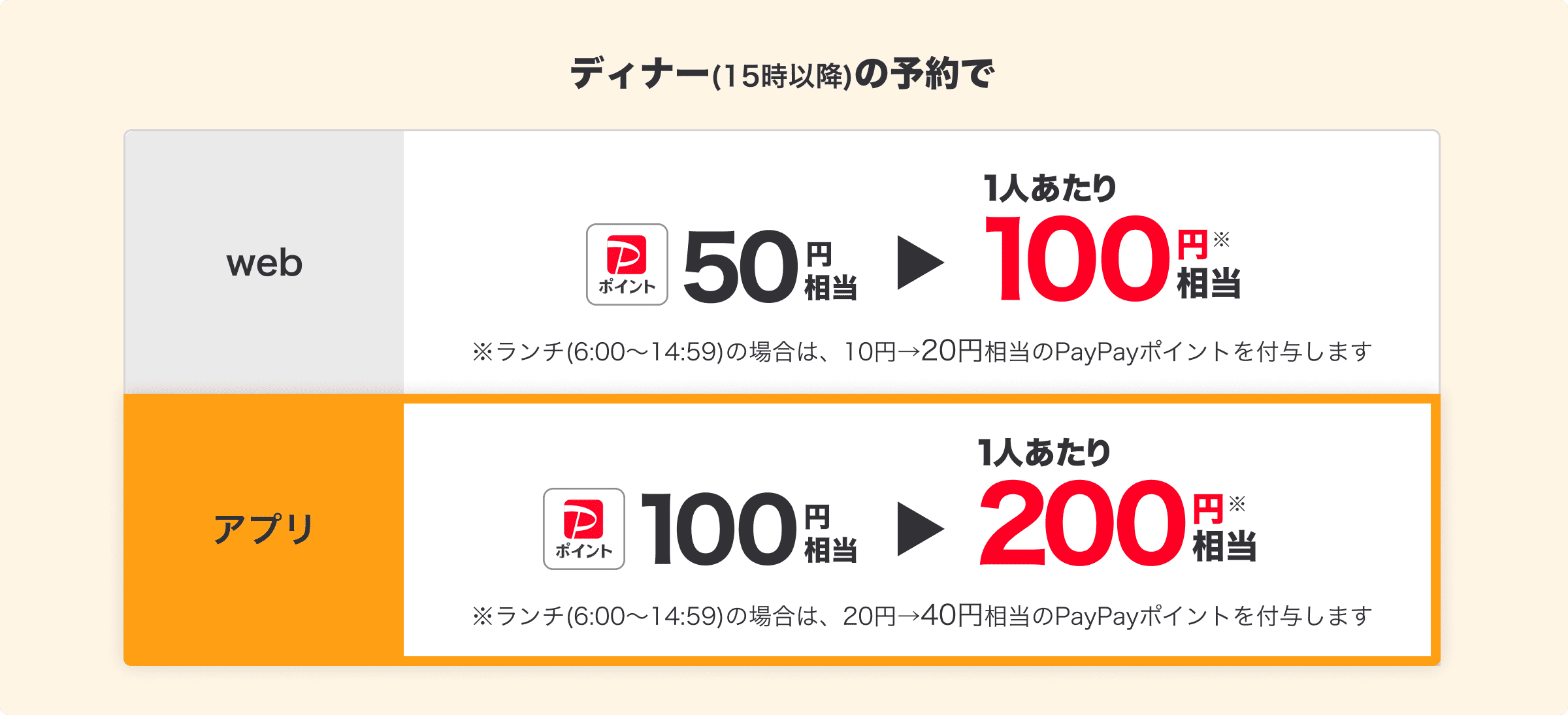 ・予約前にキャンペーンへエントリーをした方・PayPayアカウントを連携しているRettyアカウントにログインした状態で予約が完了していること