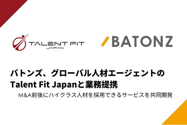 M&A・事業承継支援プラットフォーム「BATONZ(バトンズ)」を運営する株式会社バトンズ(本社:東京都中央区、代表取締役CEO:神瀬悠一、以下バトンズ)は、Talent Fit Japan株式会社(本社:東京都渋谷区、代表取締役:芝隼人、以下Talent Fit Japan)との業務提携をお知らせします。