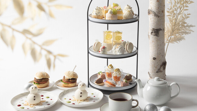 「白雪 ‐ WHITE MOMENTS ‐」は、冬の静けさや繊細な雪をテーマに、「マスカルポーネクリーム タルト」や「ホワイトチョコ カヌレ」など、白を基調としたスイーツ9種類に、セイボリー、ソフトドリンク飲み放題がセットになったアフタヌーンティー。