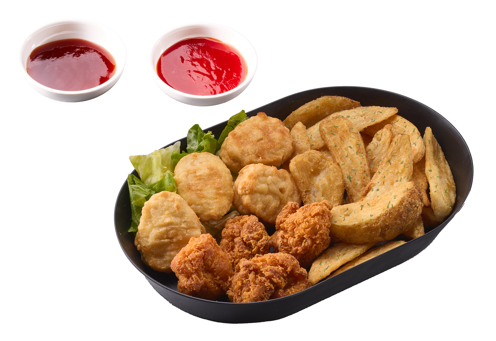 【パーティーボックス】ドミノの人気サイドメニュー3種類(ポテトフライ、ジューシーからあげ、チキンナゲット)が1つになったおトクなパーティーボックス。ケチャップ・BBQソース付き。