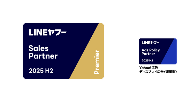 この度、Yahoo!広告・LINE広告の運用支援実績と、運用における専門性の高さを評価され、「Sales Partner」最上位の「Premier」に4期連続で認定されました。また、Yahoo!広告およびLINE広告の審査ガイドラインを遵守し、顧客である広告主とエンドユーザー双方にとって透明性と信頼性の高い広告運用を実現していることが評価され、2期連続で「Ads Policy Badge Yahoo!広告 ディスプレイ広告(運用型)」も取得しています。