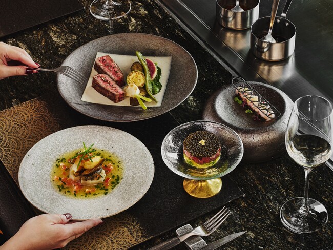 静かな高揚と密やかな一体感が満ちる、和城のカウンター。ダイヤモンドの輝きに着想を得たコースでは、黒いダイヤモンドと称されるキャビアをあしらった「キャビア 鮪 アボカドのアンサンブル」が、深みのある旨味とともに静謐な存在感を放ちます。「甘海老のタルタル 炭のアクセント」は、砕いた炭の繊細なニュアンスが、甘海老のまろやかさに輪郭を添え、海の恵みが上品に際立つ一皿。黒トリュフや鮑、季節の果実が織りなす調和は、和と洋の感性が響き合い、優雅な物語のようなひとときを紡ぎます。目の前で丹念に仕上げられる一皿一皿が、五感と心を深く満たす、優美な歓びのひとときをお過ごしください。