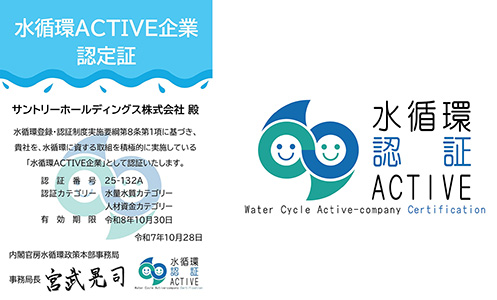 サントリーホールディングス(株)は、内閣官房水循環政策本部事務局の「水循環企業登録・認証制度」において、「水循環ACTIVE企業」に認証されました。同制度は、水循環に資する企業の取り組みを、積極的に認証することで促進し、社会全体での水循環をより一層活性化させることを目的に令和6年8月に創設されました。企業による過去3年間の取り組み実績を元に認証されます。第2回目となる令和7年度は145社が認証され、当社は水源域における森林整備・保全活動として「サントリー 天然水の森」が、社外への水循環に係る教育・啓発活動として次世代環境教育「水育(みずいく)」がそれぞれ評価され、同制度下の「水量水質カテゴリー」「人材資金カテゴリー」の双方で認証を受けています。両カテゴリーで認証を受けたのは21社です。