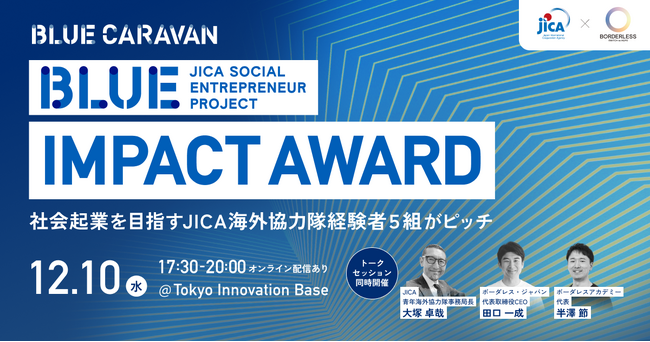 その一環として始動する「JICA BLUE CARAVAN」は、日本全国を巡り、国際協力の現場で培った知見や志を社会起業へとつなぐ挑戦を発信するリアルイベントです。初回となる東京開催では、12月10日(水)にTokyo Innovation Base(有楽町)にて、5組のJICA海外協力隊経験者によるピッチコンテスト「JICA BLUE Impact Award」を実施します。