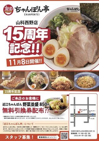 「近江ちゃんぽん亭 山科西野店」が開店15周年を迎えることを記念し、2025年11月8日(土)に“15周年記念周年祭”を開催いたします。