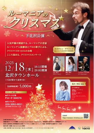 ルーマニア王室合唱団 首席指揮者のラズヴァン・アペトレイ氏が指揮を行い、プロの声楽歌手が歌います。無伴奏で歌われるルーマニアのクリスマスキャロル“コリンダ”は優しくあたたかく、心に響くことでしょう!