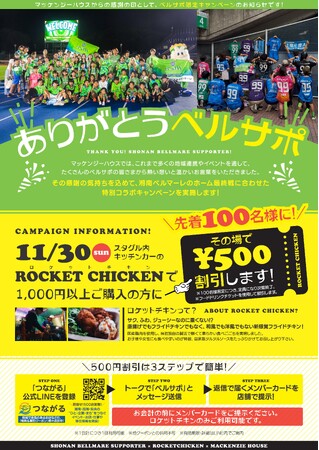 湘南・西湘・県央エリアで地域密着の家づくりを行う株式会社マッケンジーハウス(本社:神奈川県平塚市、代表取締役:大久保英二)は、湘南ベルマーレのホーム最終戦に合わせて、地域応援プロジェクト「ベルサポ限定!ロケットチキン500円割引キャンペーン」を開催いたします。