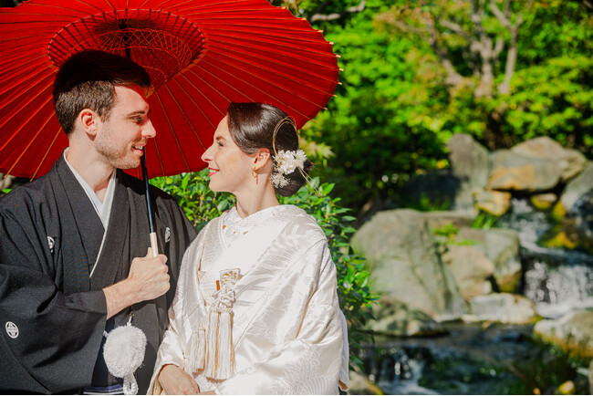 白無垢・色打掛・紋付袴など本格的な婚礼衣装で撮影。スタジオ×ロケの組み合わせも柔軟にアレンジ。