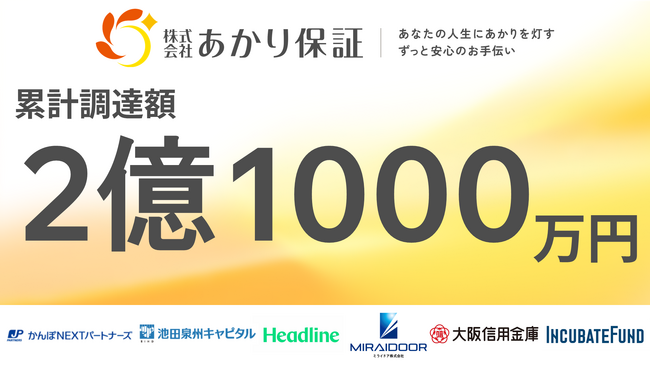 既存投資家のインキュベイトファンド株式会社様に加え、かんぽNEXTパートナーズ株式会社様、池田泉州キャピタル株式会社様、LaunchPadFund株式会社様、ミライドア株式会社様、大阪信用金庫様に「チームあかり保証」のメンバーに加わっていただきました。