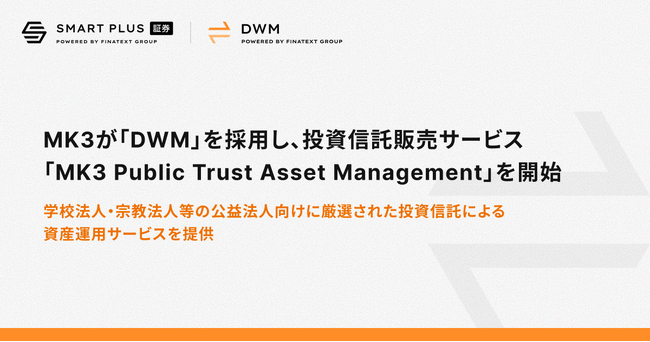 次世代金融インフラの提供を通して組込型金融を実現するFinatext グループの株式会社スマートプラス(本社:東京都千代田区、代表取締役:小林 紀子、以下「当社」)は、IFA法人MK3株式会社(本社:東京都渋谷区、代表取締役社長:林 雅巳、以下「MK3」)が、当社の証券取引プラットフォーム「Digital Wealth Manager(デジタル・ウェルス・マネージャー、以下「DWM」)」を採用したことをお知らせします。MK3は、独自ブランド「MK3 Public Trust Asset Management(MK3 パブリックトラストアセットマネジメント)」として、厳選された投資信託による資産運用サービスを2025年11月10日(月)より開始します。