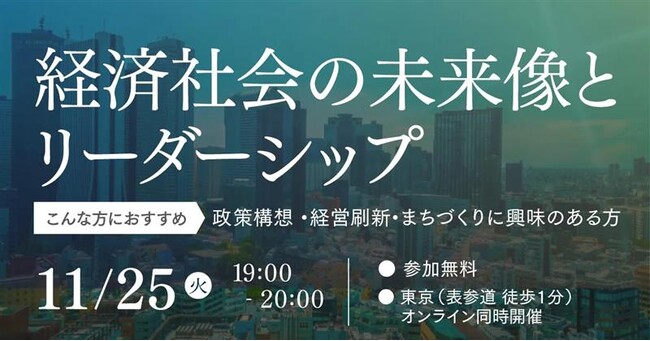 政治・経済・まちづくりを横断的に捉え、変化を恐れず動かす構想力を育む。対面&オンラインで11月25日(火)19時より開催。