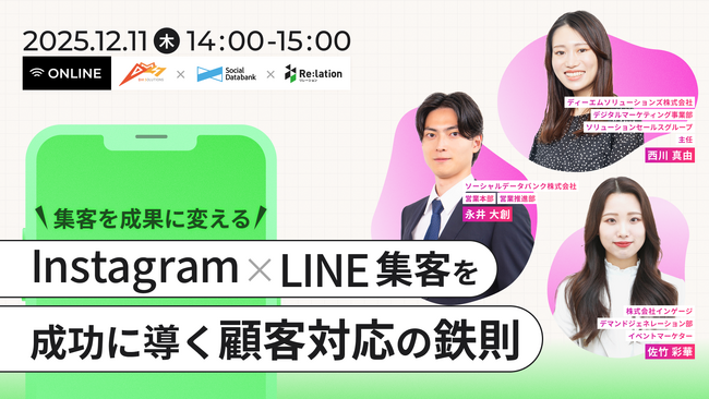 顧客対応クラウド「Re:lation(リレーション)」を提供し、6,000社以上(※1)の導入実績を誇る株式会社インゲージ(本社:大阪府大阪市、代表取締役:和田 哲也、以下インゲージ)は、2025年12月11日(木)に、ディーエムソリューションズ株式会社、ソーシャルデータバンク株式会社と共同で、ウェビナー「集客を成果に変える!Instagram×LINE集客を成功に導く顧客対応の鉄則」を開催することをお知らせします。