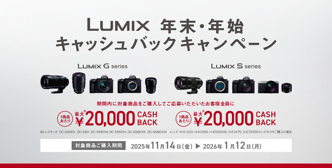 パナソニック株式会社は、LUMIX Sシリーズ/Gシリーズ ボディ・レンズの対象商品をご購入の上ご応募いただいた方を対象とした「LUMIX 年末・年始キャッシュバックキャンペーン」を2025年11月14日(金)より実施します。