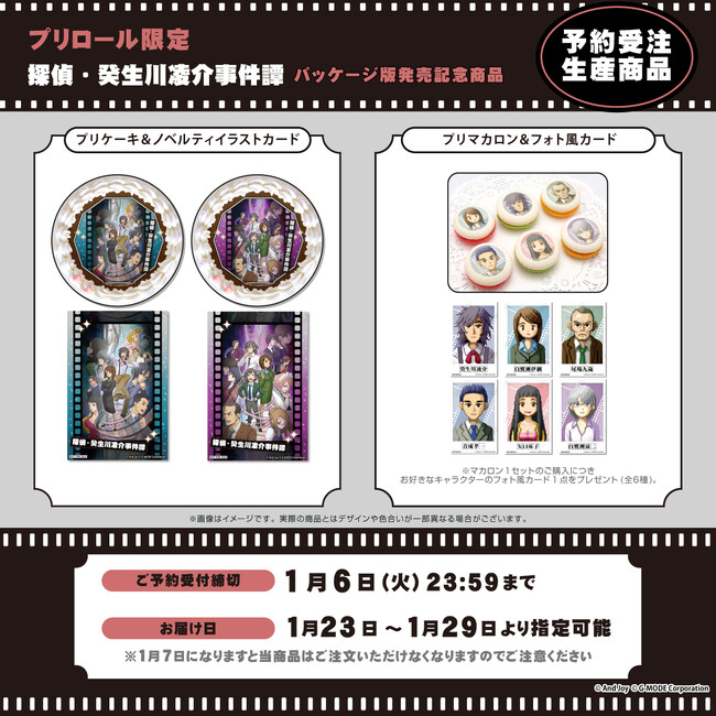 株式会社ジー・モード(本社:東京都品川区、代表取締役社長:加藤征一郎 https://gmodecorp.com/)は、様々なアニメ、ゲーム、漫画作品等のキャラクタースイーツを取り扱うプリロール(https://priroll.jp/)より『探偵・癸生川凌介事件譚』のパッケージ版発売を記念したケーキおよびマカロンを発表、本日より予約受付開始したことをお知らせします。