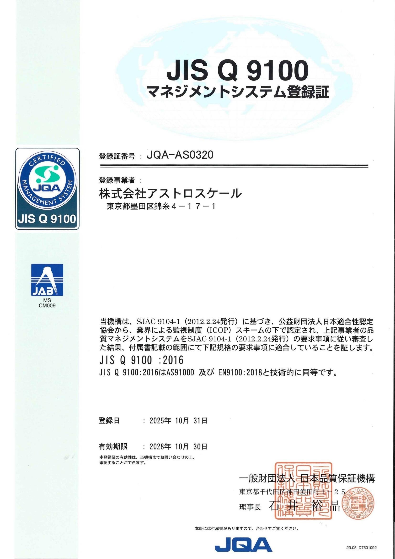 持続可能な宇宙環境を目指し、軌道上サービスに取り組む株式会社アストロスケールホールディングス(本社:東京都墨田区、創業者兼 CEO 岡田光信)の日本子会社である株式会社アストロスケール(本社:東京都墨田区、代表取締役社長 加藤英毅、以下「アストロスケール」)はこの度、航空宇宙・防衛産業に特化した品質マネジメントシステムの国際規格であるJIS Q 9100の認証を取得したことをお知らせいたします。