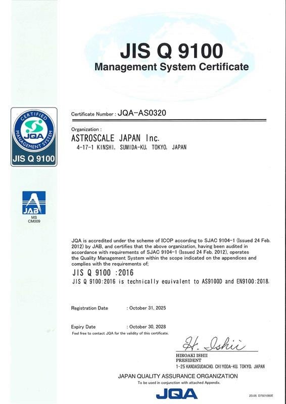 アストロスケール、JIS Q 9100の認証を取得