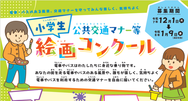 東京都交通局では、昨年度に引き続き、小学生のお子様を対象に、誰もが楽しく、気持ちよく公共交通を利用するためのマナーについて考える機会とするとともに、公共交通について愛着や親しみを感じてもらうことを目的として、絵画コンクールを実施します。たくさんのご応募をお待ちしております。