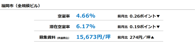 空室率は前月比マイナス0.26ポイントの4.66%となった。新築ビルを中心に空室消化が進み、主な低下要因となっている。エリア別では「天神」が前月比マイナス1.0ポイントと大幅に低下した。潜在空室率は前月比からマイナス0.19ポイントの6.17%だった。