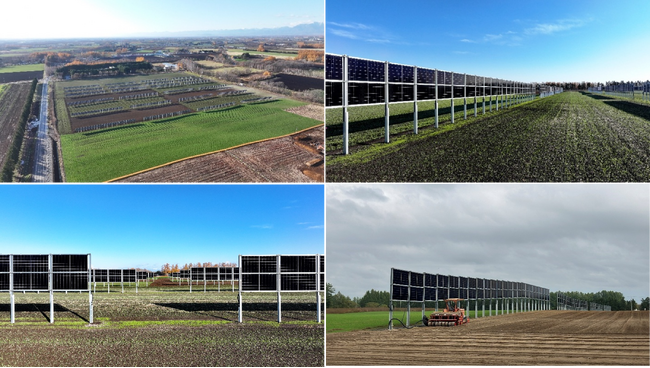 本設備は、農作物の収量への影響や農業機械作業への干渉を抑えることを期待し、土地や地上部の空間の専有面積が少ない垂直設置型の太陽光発電設備を採用しています。