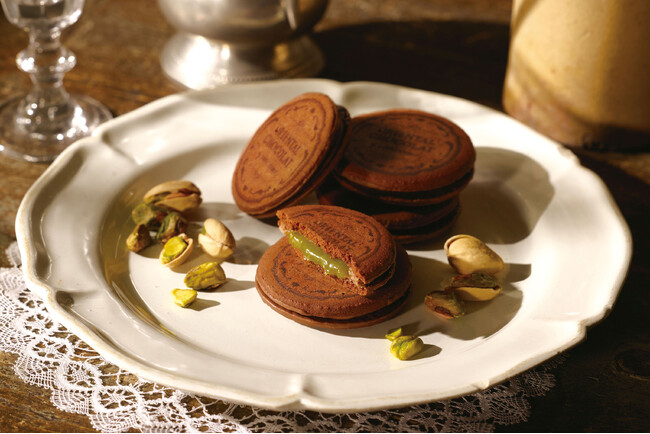 人気の味わい“ピスタチオ”が、期間限定販売で再登場!今回は、新たな装いのパッケージでお届けいたします。この時期だからこそ味わいたい、チョコレートとピスタチオの味わいを閉じ込めた「オリエンタルショコラサンド(ピスタチオ)」。ピスタチオの風味が香る特製ソースを、ミルクチョコレートでコーティングし、ココアクッキーでサンドした濃厚な味わいの一品です。