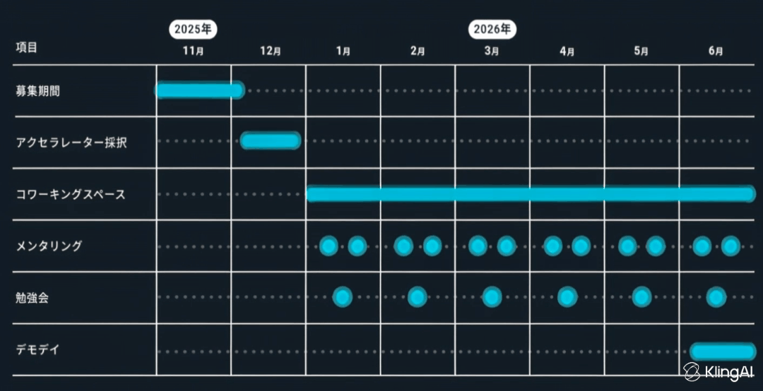 2025年11月から募集を開始し、選考・採択を経て2026年1月よりプログラムを開始予定です。勉強会・メンタリング・ピッチイベントを経て、半年間の支援を実施します。