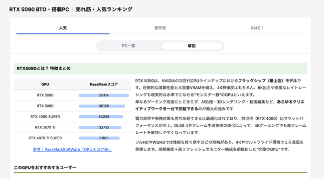国内最大級のゲーミングPC検索サイト「gg」がRTX5090搭載PC一覧ページに解説タブを設置