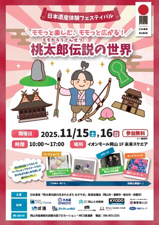 日本遺産「桃太郎伝説の生まれたまち おかやま」推進協議会(事務局:岡山市産業観光局観光部プロモーション・MICE推進課、岡山市北区大供一丁目1番1号)は、日本遺産「『桃太郎伝説』の生まれたまち おかやま~古代吉備の遺産が誘(いざな)う鬼退治の物語~」のストーリーを体感でき、親しめるイベントとして、令和7年11月15日(土)・16日(日)の両日、イオンモール岡山1階未来スクエア(岡山市北区下石井一丁目2番1号)で日本遺産体験フェスティバル「モモっと楽しむ、モモっと広がる!桃太郎伝説の世界」を開催します。