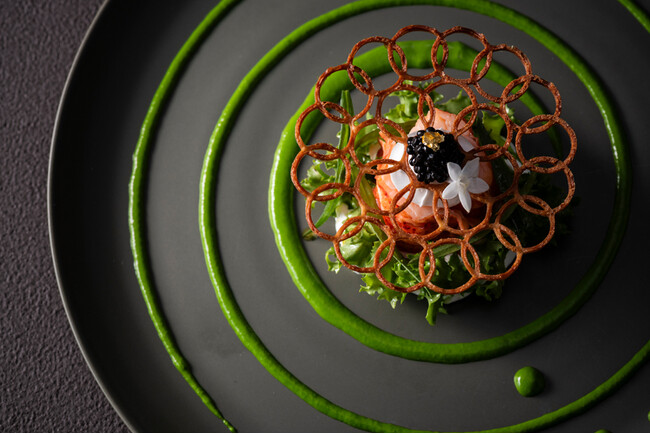 高層階からの夜景を望む空間で、和のやさしさとフレンチの華やかさが調和するクリスマス限定コースをご提供。大阪産をはじめとした関西の旬食材を取り入れ、前菜からデザートまで、見た目にも華やかでどこかホッとする味わいに仕上げました。料理に寄り添うソムリエ厳選のワインやシャンパーニュ、ノンアルコールペアリングもご用意。テーブルを彩る装花は、お食事の余韻とともにお持ち帰りいただける“クリスマスギフト”としてご用意しています。ディナーだけでなく、ランチタイムもクリスマスらしい彩りと温かみを感じるメニューをお楽しみください。<クリスマスディナーコース>