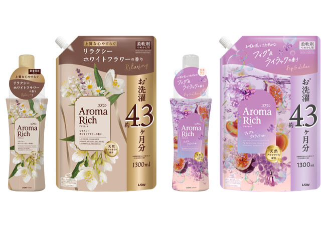 ・“癒し、リラックス”をテーマにした『ソフラン アロマリッチ リラクシーホワイトフラワーの香り』、“みずみずしさ”をテーマにした『ソフラン アロマリッチ フィグ&ライラックの香り』を新発売