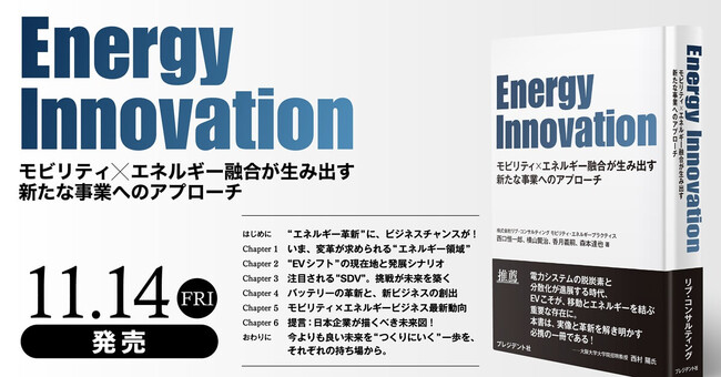 モビリティ領域に強みを持ち、大企業の事業開発領域支援からベンチャー・中堅企業の経営コンサルティングを行う株式会社リブ・コンサルティング(所在地:東京都中央区、代表取締役:関厳)はGX・EV領域における事業開発コンサルティングプロジェクトを通して得た独自の知見を基に、モビリティ×エネルギー領域の融合から生まれる新事業やビジネスのアプローチを探る提言をまとめた書籍『Energy Innovation』を、2025年11月14日(金)、プレジデント社より全国書店にて発売いたします。