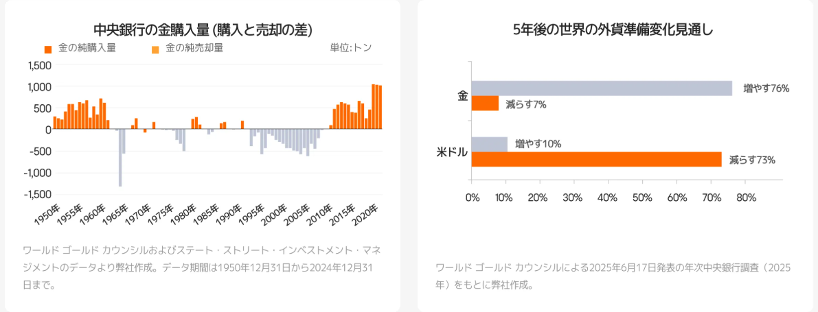 外貨準備の多様化や、自国通貨の安定を図る目的から、複数の国の中央銀行が、近年、記録的なペースで金を買い入れていることも金価格を押し上げる大きな要因です。調査によると、今後5年程度はこの流れが継続するとみられています。