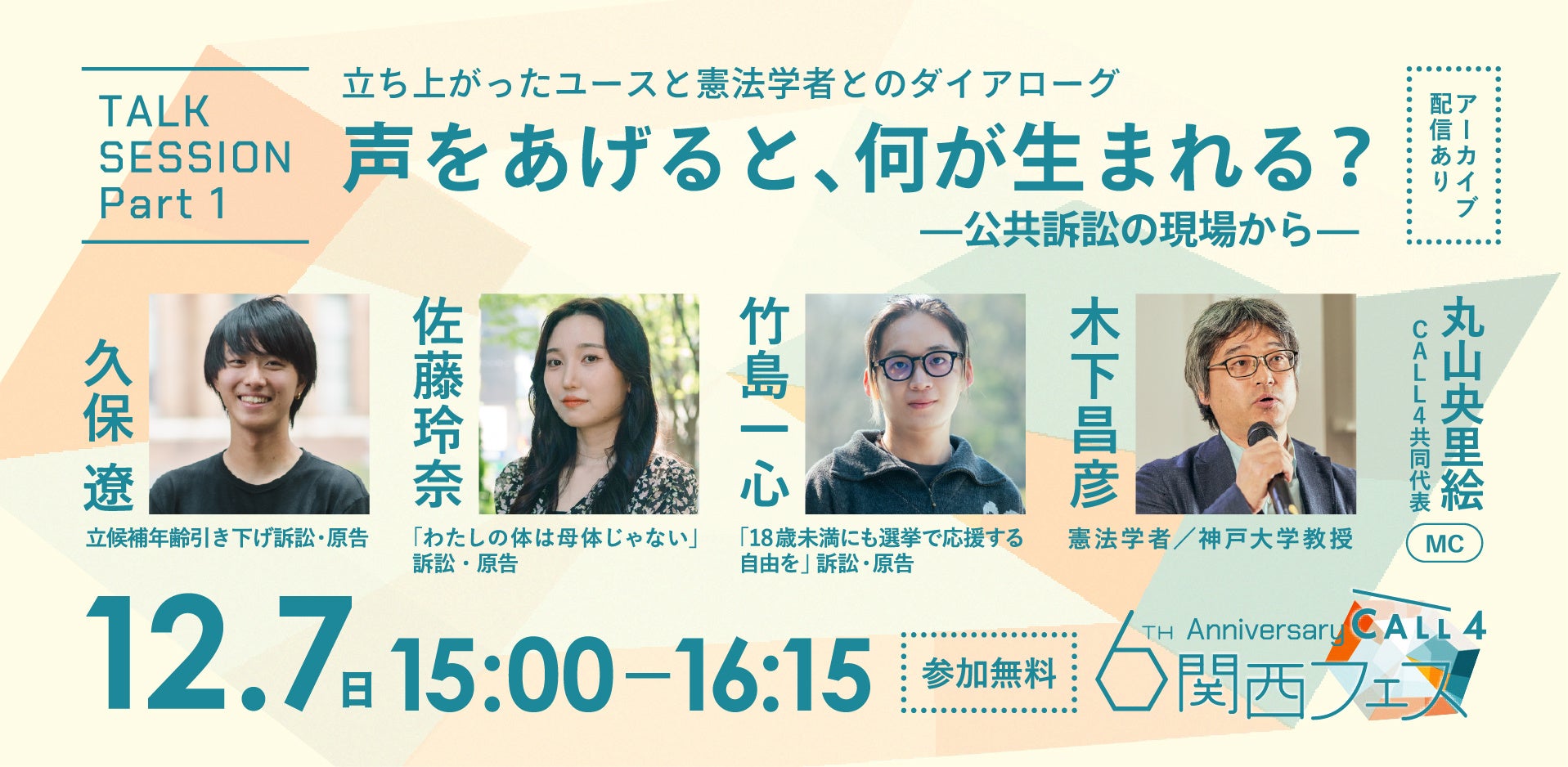 日本初(※1)の公共訴訟支援に特化したウェブプラットフォームCALL4(コールフォー)(運営:認定特定非営利活動法人CALL4、共同代表理事:谷口太規、丸山央里絵)は、正式リリース6周年を記念して12月7日(日)に大阪で「CALL4関西フェス」を開催いたします。