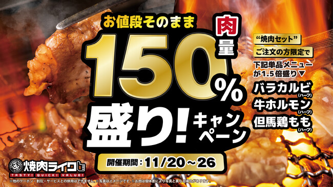 株式会社焼肉ライク(本社:東京都港区、代表取締役:高橋尚也)が展開する「焼肉ライク」は、2025年11月20日(木)~26日(水)の期間限定で、焼肉セットをご注文のお客様を対象に、対象の単品肉(ハーフ)を追加注文すると“お値段そのまま”でお肉が150%盛りになるキャンペーンを開催します。