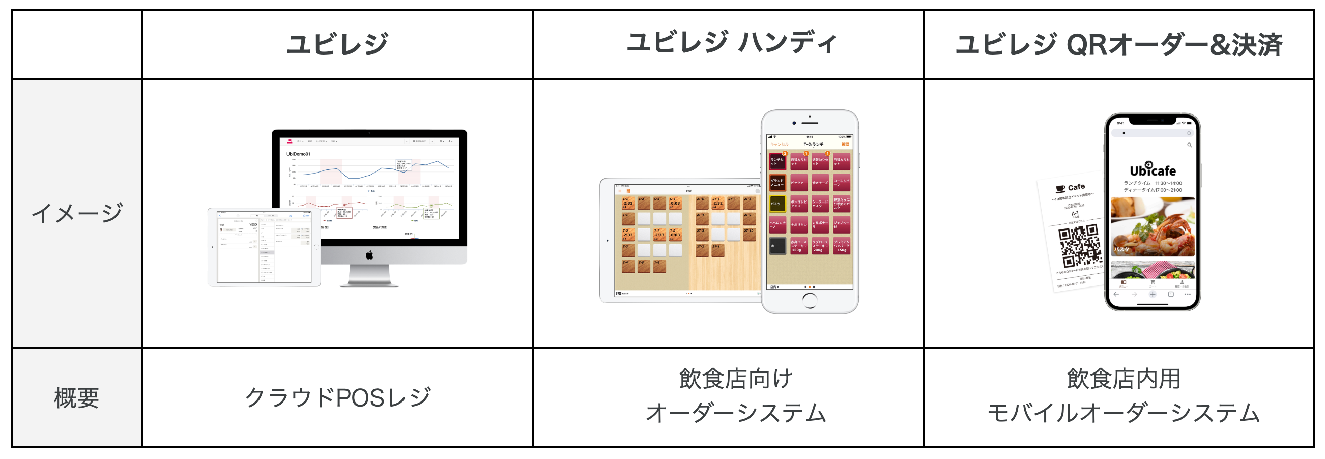 事業内容:クラウド型POSレジシステム『ユビレジ』、オーダーエントリーシステム『ユビレジ ハンディ』、在庫管理と発注業務をサポートする『ユビレジ 在庫管理』、スマホで注文と決済ができる『ユビレジ QRオーダー&決済』の開発と提供、および大規模展開・チェーン店向けサービス『ユビレジ エンタープライズ』の提供 https://ubiregi.jp/