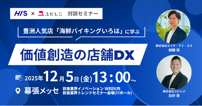 “カンタンがいちばん”がコンセプトのクラウドPOSレジ「ユビレジ」を提供している株式会社ユビレジ(本社:東京都渋谷区、代表取締役:木戸 啓太)は、2025年12月3日(水)~5日(金)に幕張メッセで開催される「飲食業界イノベーションWeek」に出展いたします。さらに会期最終日の12月5日(金)には、ユビレジ取締役の白砂晃と「海鮮バイキング いろは」を展開する株式会社エイチ・アイ・エス 新規事業統括本部飲食事業グループの相磯亮氏による価値を作り出す店舗DXについての対談セミナーを実施いたします。