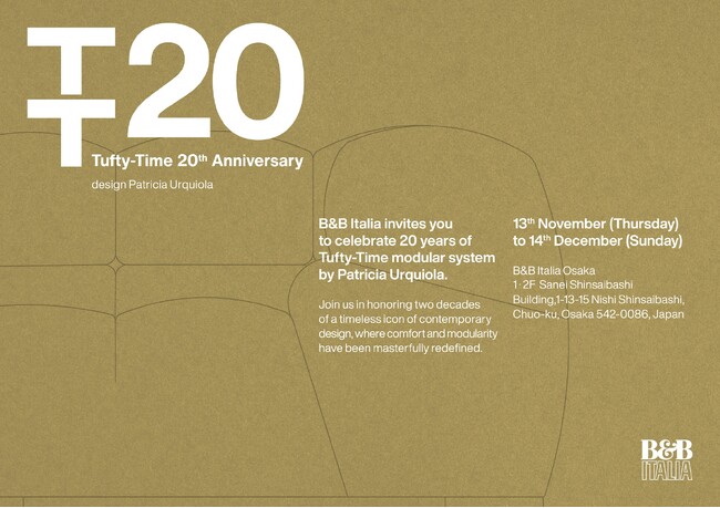 株式会社progetto81(本社:東京都港区、代表取締役CEO:武井 総司)は、2025年11月13日(木)~12月14日(日)の期間、B&B Italia Osaka にて、発表から20周年を迎えた 「Tufty-Time(タフティータイム)」の最新モデル「Tufty-Time 20(タフティータイム 20)」の先行特別展示を行います。