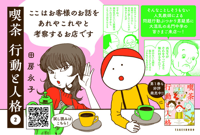 株式会社竹書房(所在地:東京都千代田区、代表取締役社長:宮田 純孝)は、WEBコミックサイト「竹書房コミックエッセイweb」連作作品、『喫茶 行動と人格』第2巻(著:田房永子)を、2025年11月13日(木)に発売しました。