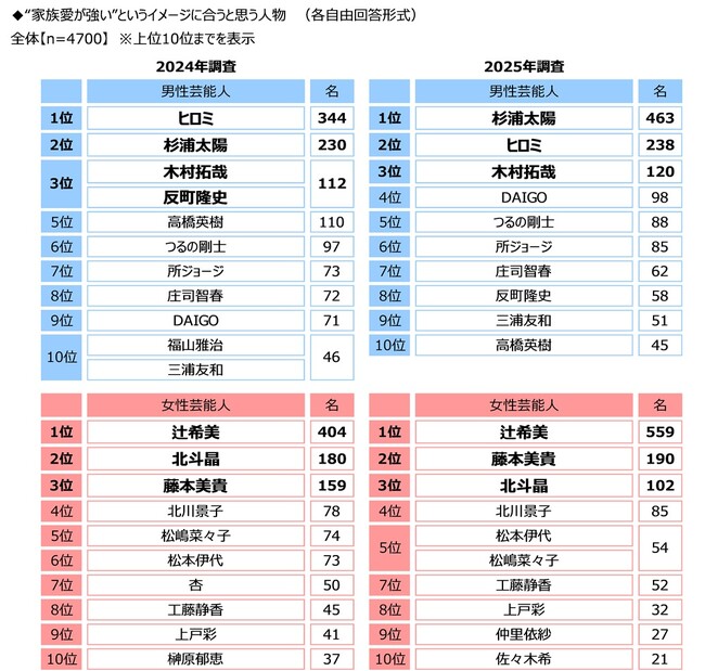“家族愛が強い”というイメージに合う【芸能人】についてみると、男性芸能人では1位「杉浦太陽さん」(463名)、2位「ヒロミさん」(238名)、3位「木村拓哉さん」(120名)、女性芸能人では1位「辻希美さん」(559名)、2位「藤本美貴さん」(190名)、3位「北斗晶さん」(102名)となりました。2025年に、第5子が誕生したことで話題となった杉浦太陽さん&辻希美さん夫妻がそれぞれ1位という結果となりました。