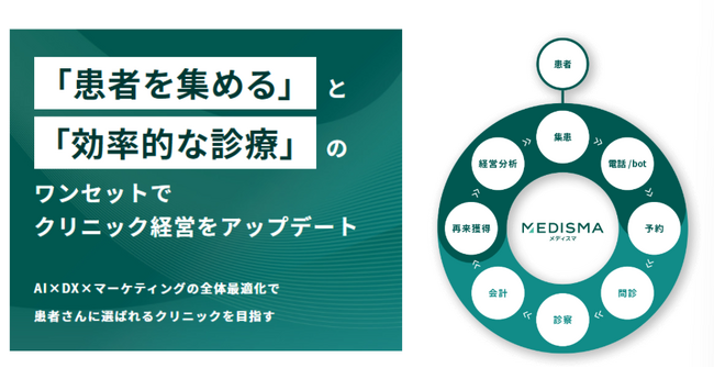 医療業界では昨今、人手不足が深刻化しており、AI・ITを活用した業務効率の改善が急務となっております。当社は、医療DXの一翼を担うべく、企業ミッション「医療を便利にわかりやすく」をより推進すべく、創業より培ってきたクリニックの集患・マーケティング支援を一貫して行ってきた強み、またWEB予約・WEB問診事業の統合を経て得た新たなナレッジを活かし、集患・マーケティング、電話受付、予約、問診・カルテ作成、会計決済をはじめ、クリニック経営に必要な一連のシステム・サービスを事業展開の中核と位置付け、新サービス・ブランド「MEDISMA」シリーズとして提供を開始致します。また、それらのサービスから様々なデータを集計、分析することでクリニック経営を多角的・総合的に支えて参ります。