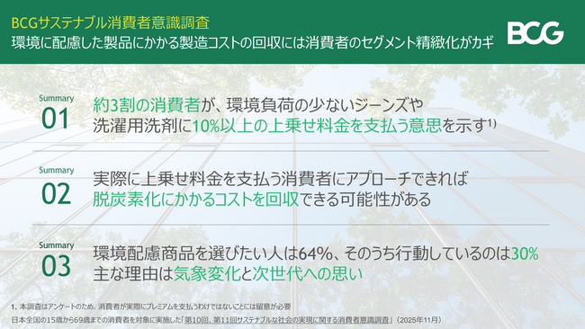 約3割の消費者が環境に良い商品に対し10%の上乗せ料金を支払う意思があると回答~BCG調査