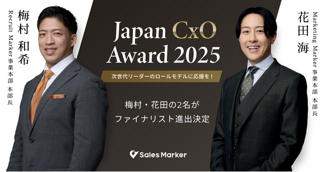 「顧客起点」で営業やマーケティング活動を戦略的に自動化する国内初※1の新しい成長モデル「インテントセールス」を実現する『Sales Marker(セールスマーカー)』。その開発元である株式会社Sales Marker(本社:東京都渋谷区、代表取締役 CEO:小笠原 羽恭、以下:当社)は、「Japan CxO Award 2025」にて、Marketing Marker事業本部長・花田 海と、Recruit Marker事業本部長・梅村 和希の2名が、それぞれ「セールスマーケ部門」「U40部門」でファイナリストに選出されたことをお知らせします。